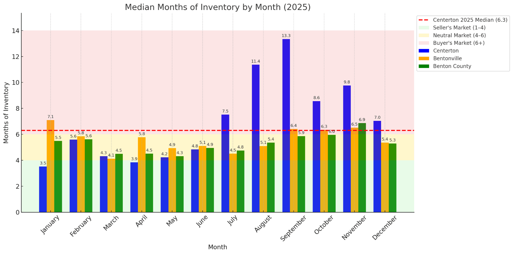 Centerton ended the year at 7.04 months of inventory, with a full-year median of 6.32. Unless inventory spikes sharply, which there are no indicators of right now, prices tend to appreciate at a normal pace.
