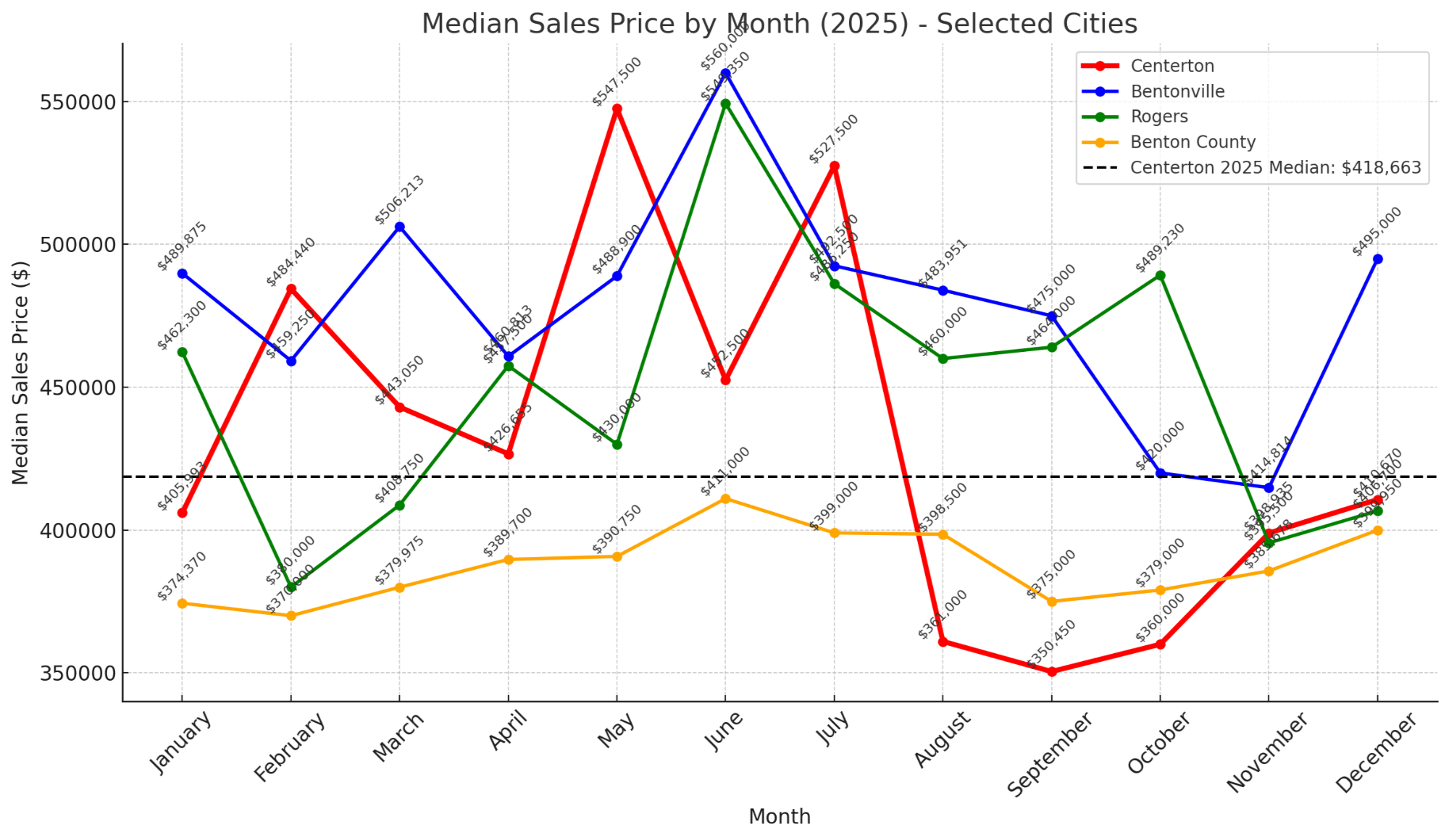 Bentonville: $495,000 (up 9.5% vs December 2024)