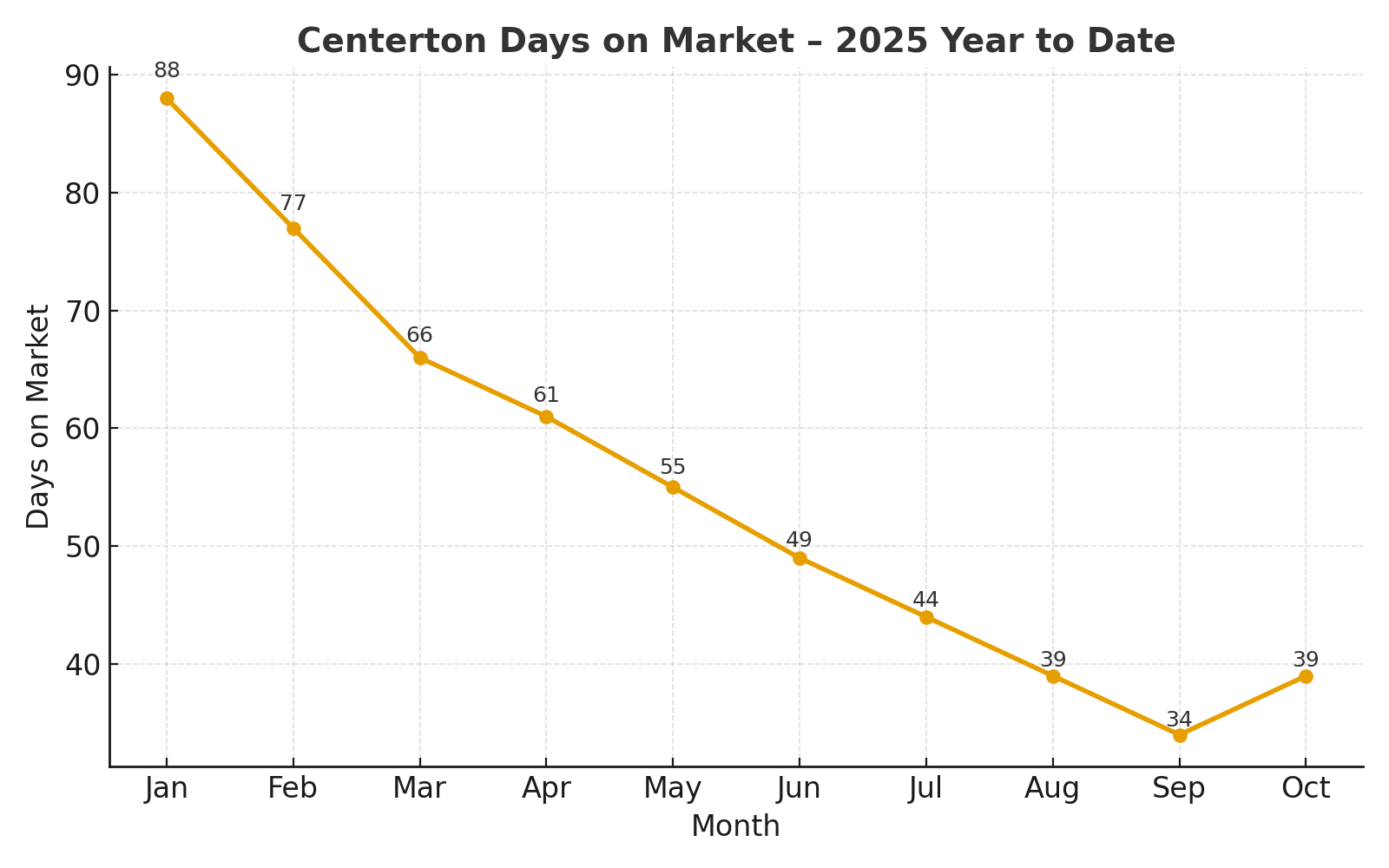 Homes in Centerton averaged 39 days on market in October, slightly up from 34 in September. Back in January, the average was 88 days, showing clear improvement throughout 2025.