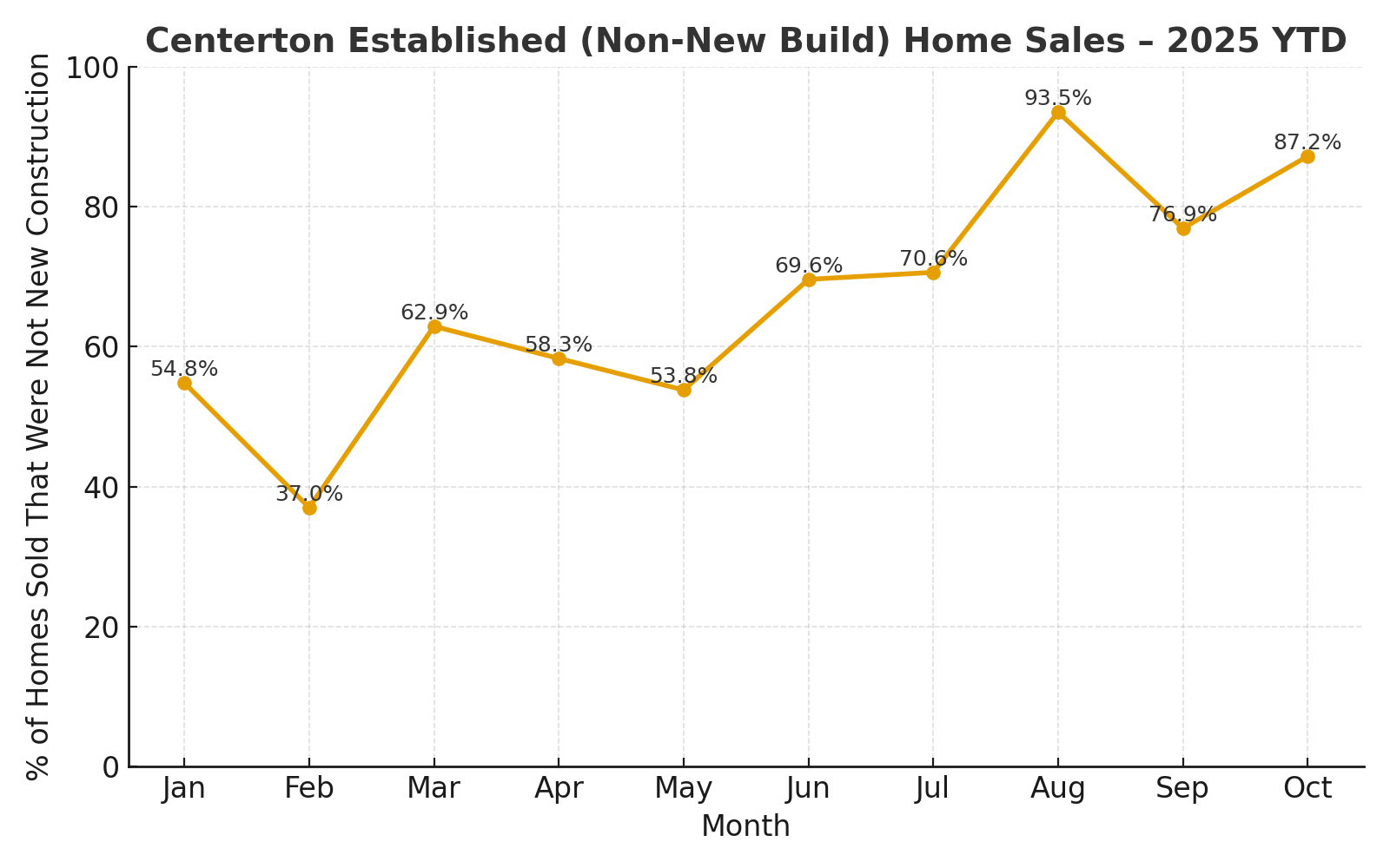 While new construction continues to lead Centerton’s active inventory, established homes remain a key value segment for today’s buyers. Of the 39 homes sold in October, 34 were established resales, showing that this side of the market still drives the majority of local closings.