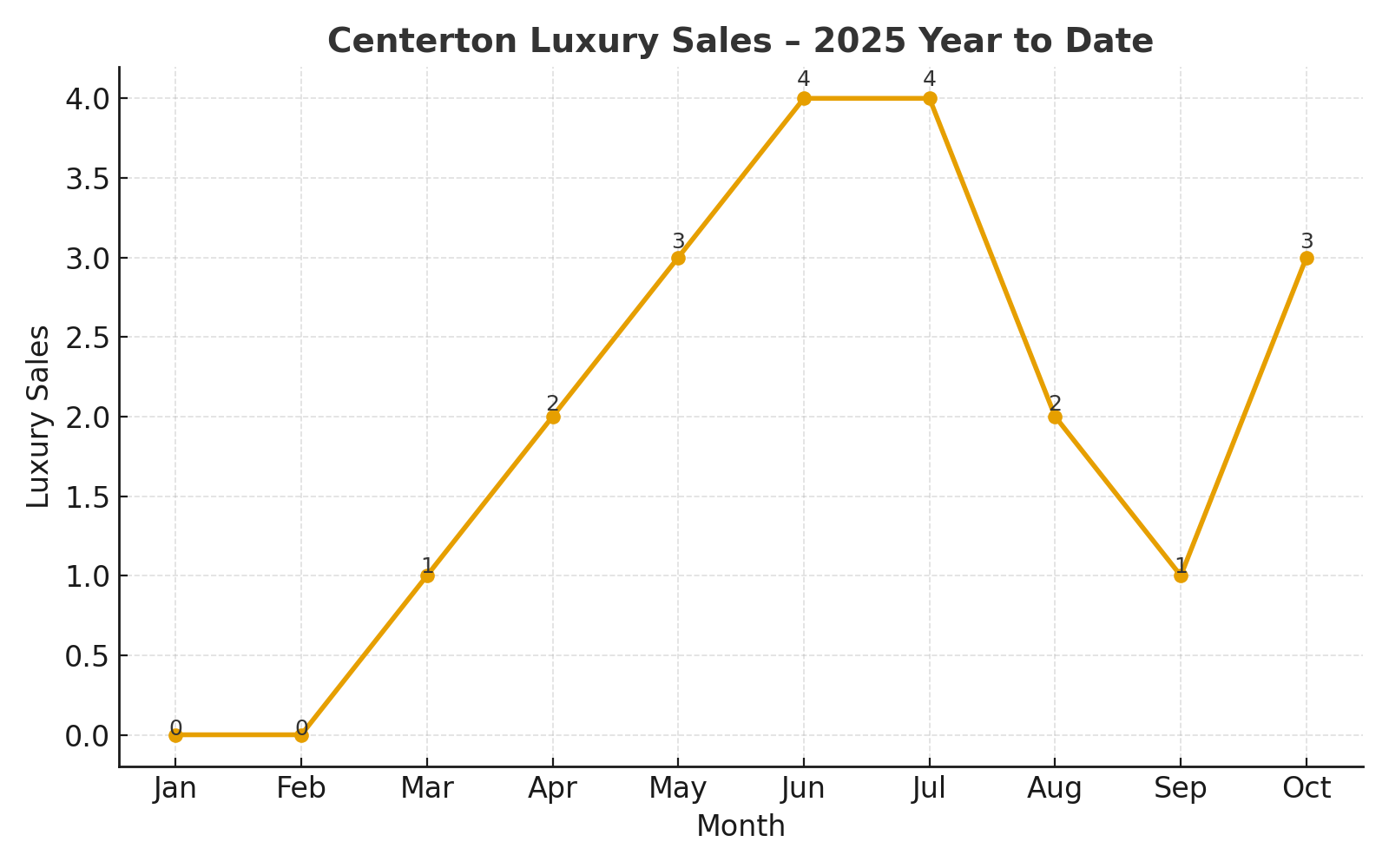 Three luxury homes closed in October, signaling renewed confidence in Centerton’s high-end market. Luxury buyers are engaged and selective, responding quickly when standout properties become available.