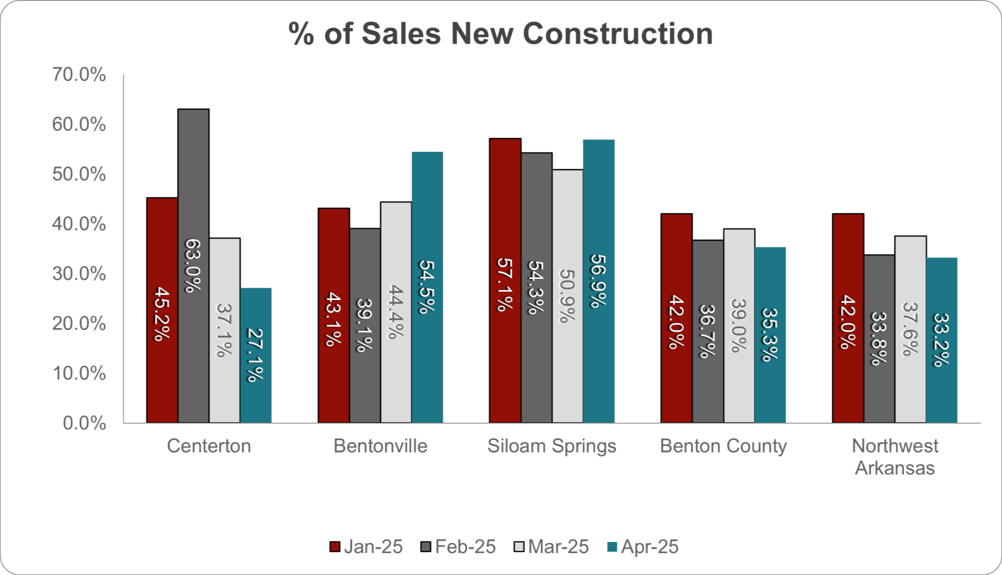 Centerton posted its highest sales month so far in 2025, with 48 homes sold in April—a 37% increase from March. While Bentonville and Siloam Springs saw month-over-month declines, Centerton's consistent growth signals a healthy and competitive local market. New construction made up just over a quarter of total sales, which suggests buyers are not only drawn to brand-new builds but also remain highly active in the resale market.