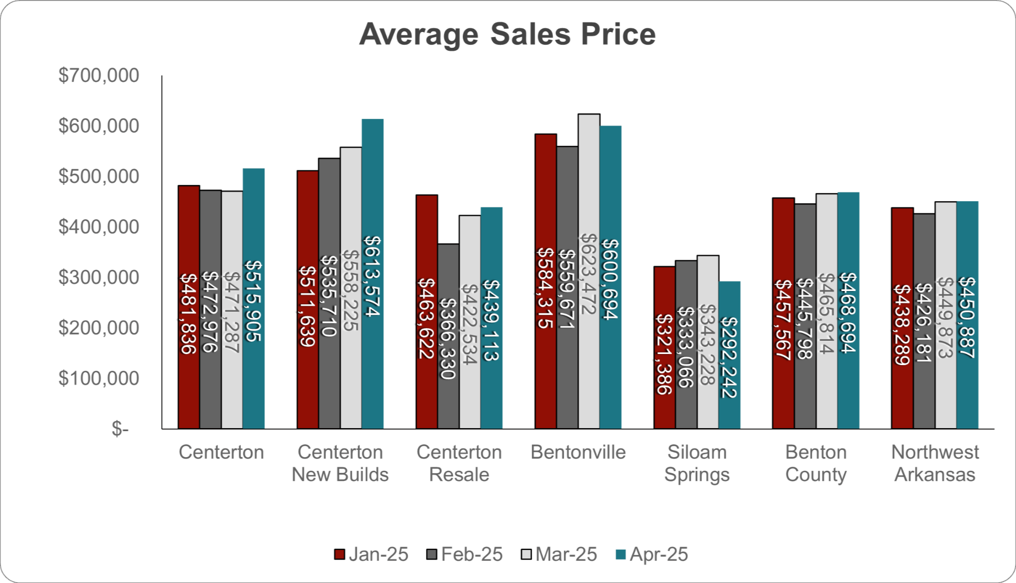 Centerton posted one of the strongest month-over-month price increases in the region for April, with average sales prices jumping over $44,000. This sharp rise indicates growing demand, particularly for larger or more upgraded homes, and underscores Centerton’s continued popularity with both local and relocating buyers. While other cities like Bentonville and Siloam Springs saw mixed or declining trends, Centerton’s pricing trajectory points to healthy buyer activity and strong perceived value.