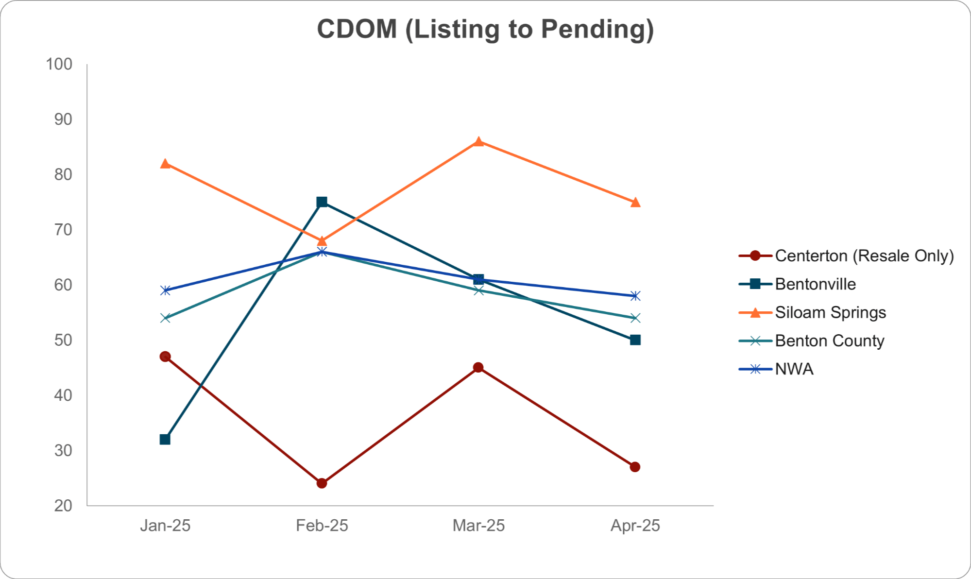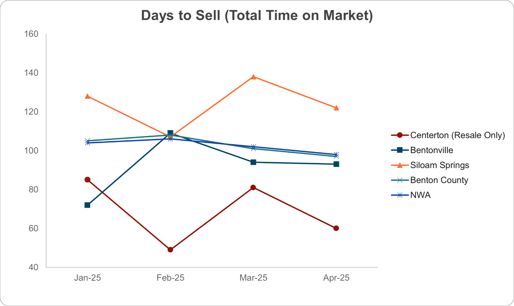 Centerton saw the most dramatic improvement across the board this month. Homes went under contract nearly 30 days faster and closed twice as quickly compared to March. This speed confirms what we’re seeing in the rest of the data—buyer demand is back in full swing, especially for well-prepped listings priced appropriately.