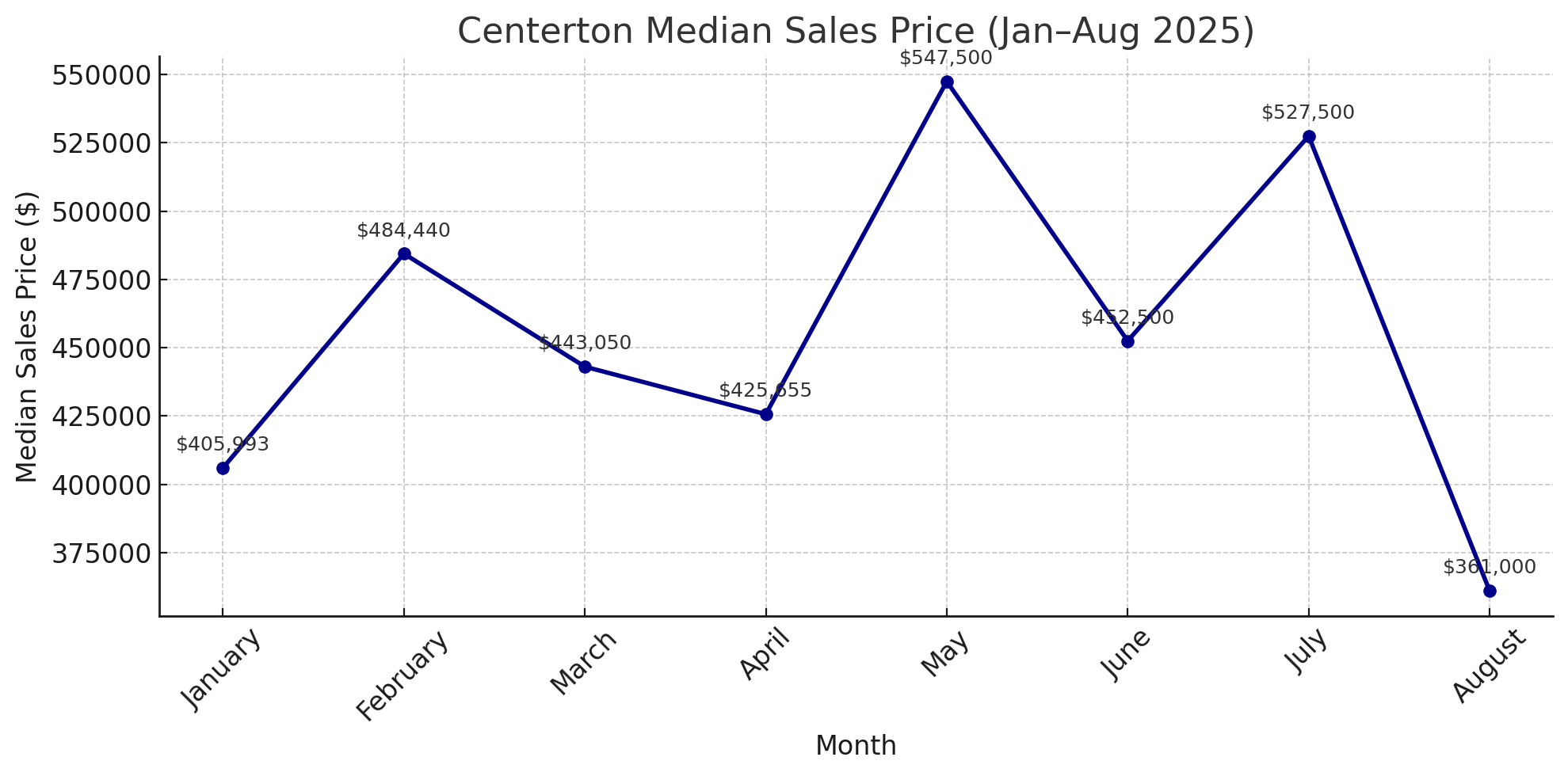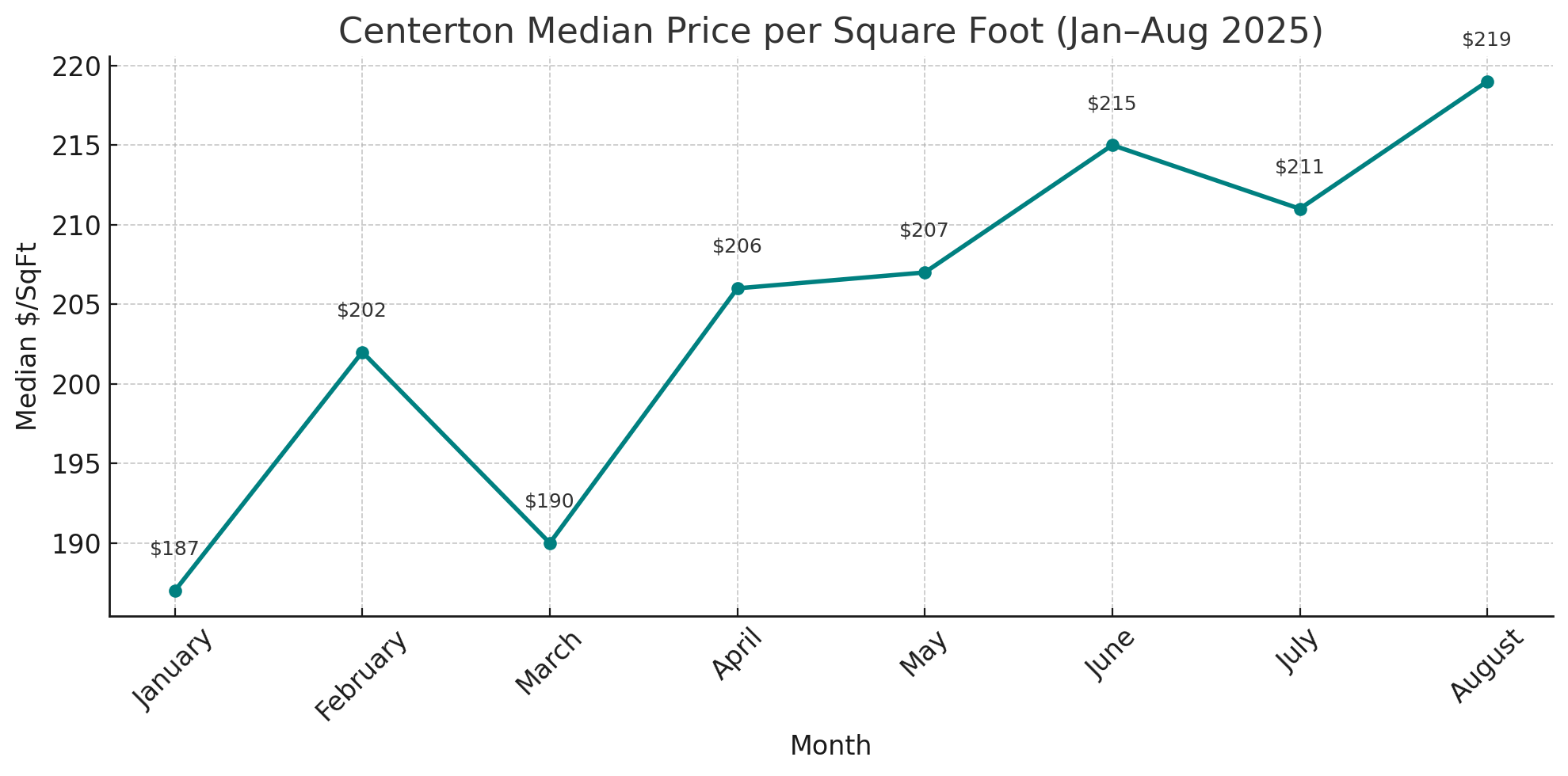 🗓️ Centerton’s Median $/SqFt (Jan–Aug 2025):
