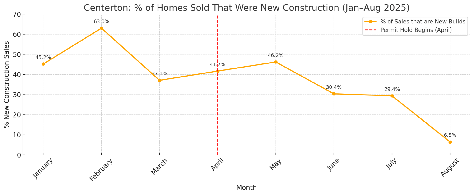 New construction made up just 6.5% of sales in Centerton — far below the regional average — due to the ongoing permit hold.